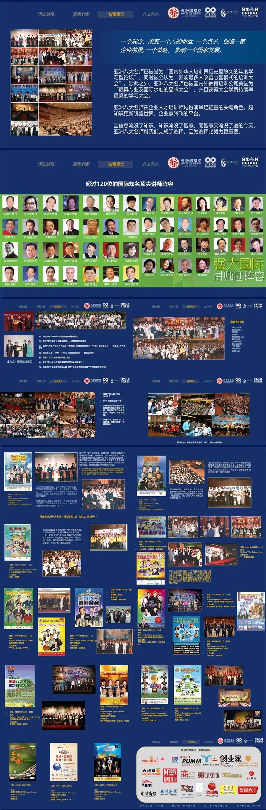 现今,《亚洲八大名师论坛》在企业界掀起了一波又一波的成功企业家学习热潮,也为企业提供了在全球化的竞争中具备不战而胜的知识力量,成为名符其实的国际化学习品牌!