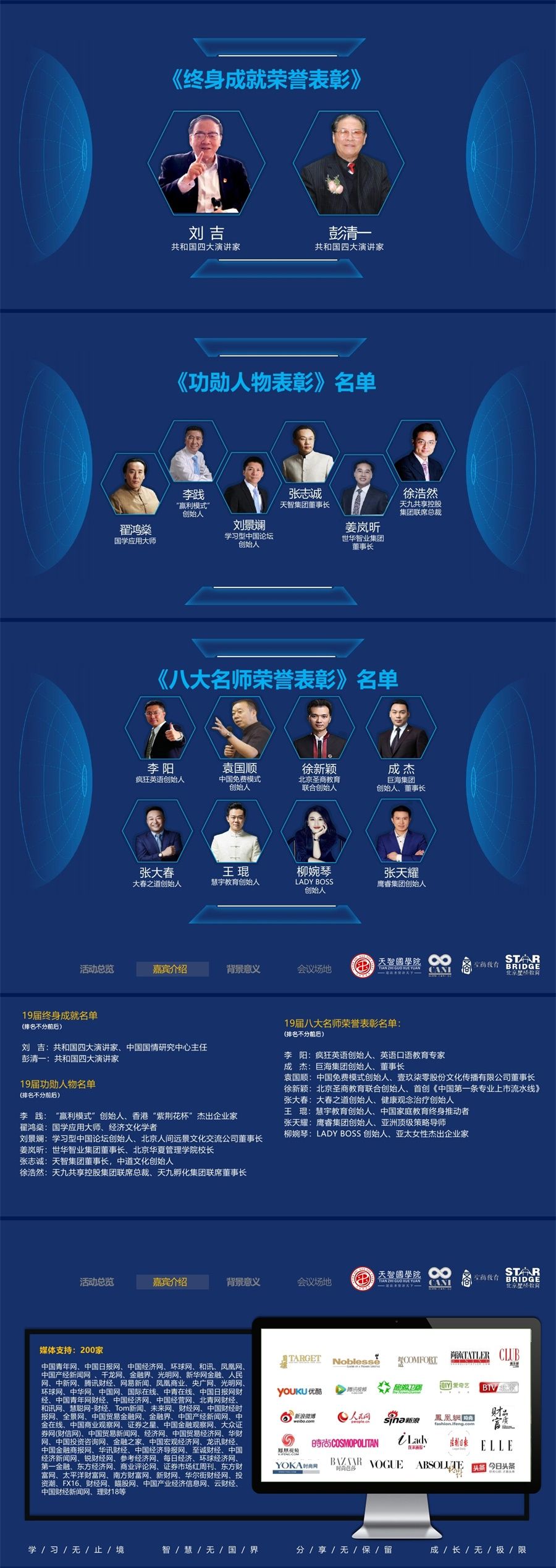 经过19年的耕耘,《亚洲八大名师论坛》已经吸引了中国、中国香港、中国澳门、中国台湾、马来西亚、新加坡、汶莱、印尼等国等国家地区的数百位华语名师参与评选,同时组建了超过120位的国际知名顶尖讲师阵容,影响人数超过百万。