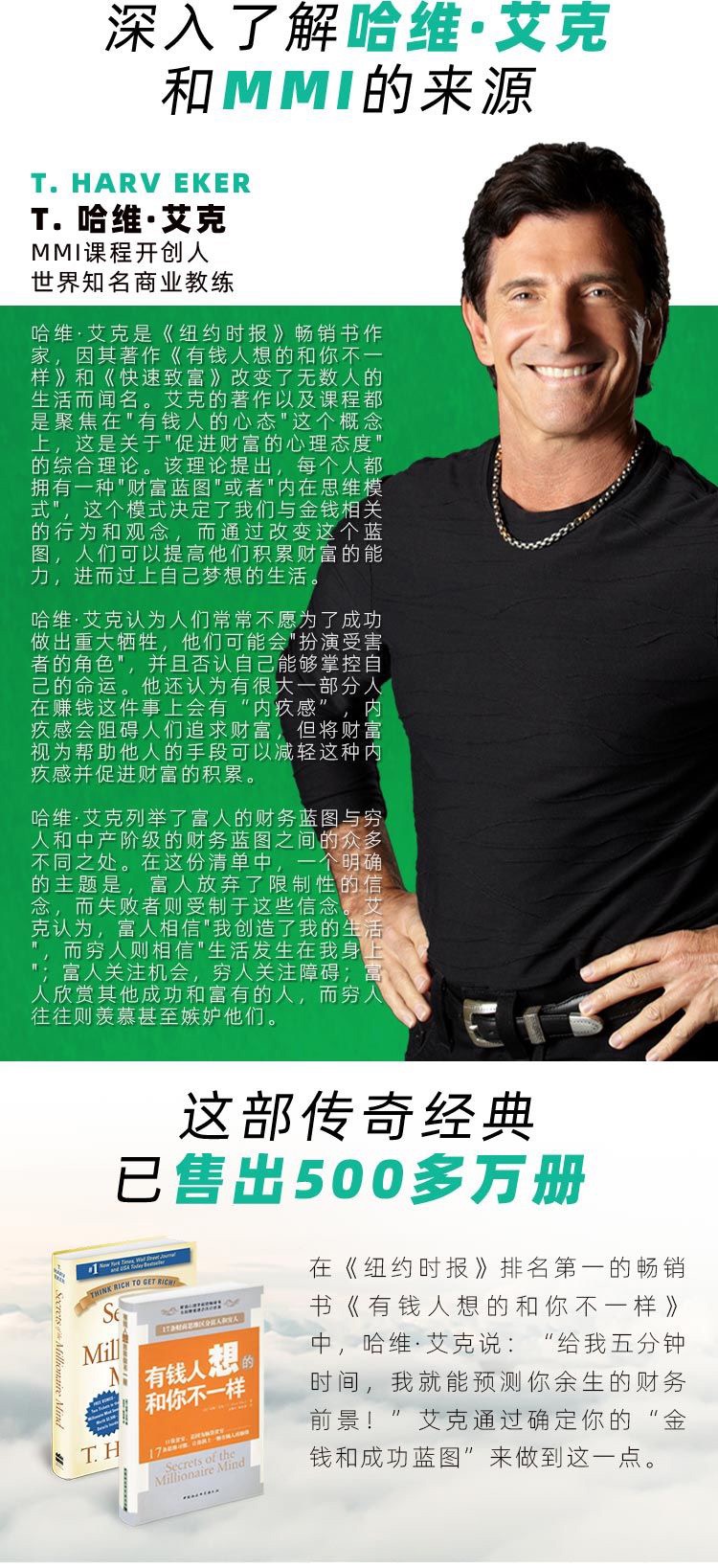他痛定思痛,回顾自己的成长背景和金钱观,分析各种与致富有关的内在思维。他发现,每个人心里都有一张“金钱蓝图”,假如不修改这张蓝图,那么就算赚了大钱,这笔钱也不会留在身边太久。